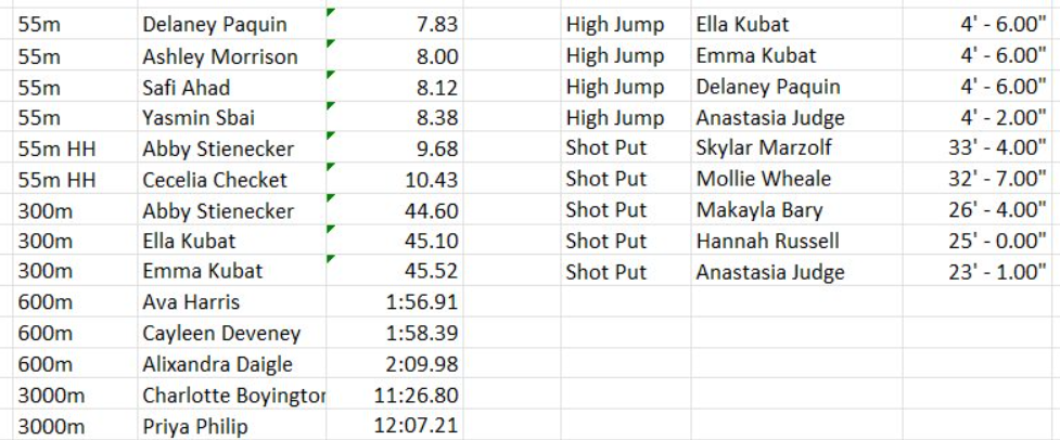 Pinkerton also had some great looking early season times in the 300m (Abby Stienecker, Ella and Emma Kubat, Rylee Robinson), 600m (the ever-present Rzasa and Blake), and the 3000m (Bedard and Marzolf 1-2 . . . that’s *Kali*, of course). And can we get Mollie Wheale into an indoor pentathlon? 9.32 55m HH and 32-7 shot put let’s go.