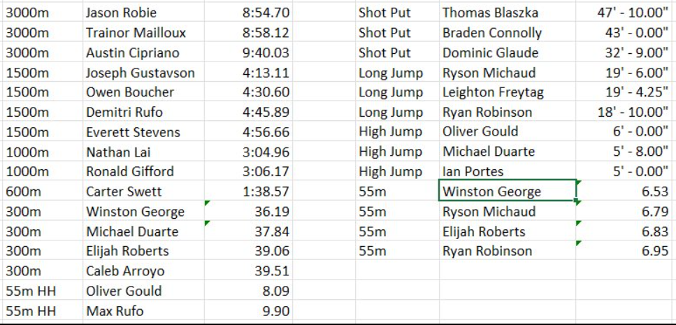 Travis Cavallo got onto the Junior list in a big tie for 3rd. I’m looking forward to some PRs to help me clean up all those hand-timed ties! Also on the ridiculous scale in the 55m: the top four Astros in the trials (adding in Ryson Michaud and Elijah Roberts) would have matched or broken the school record of my time (6.6h), lo these 30 years ago. For some of you . . . that’s your era, too!